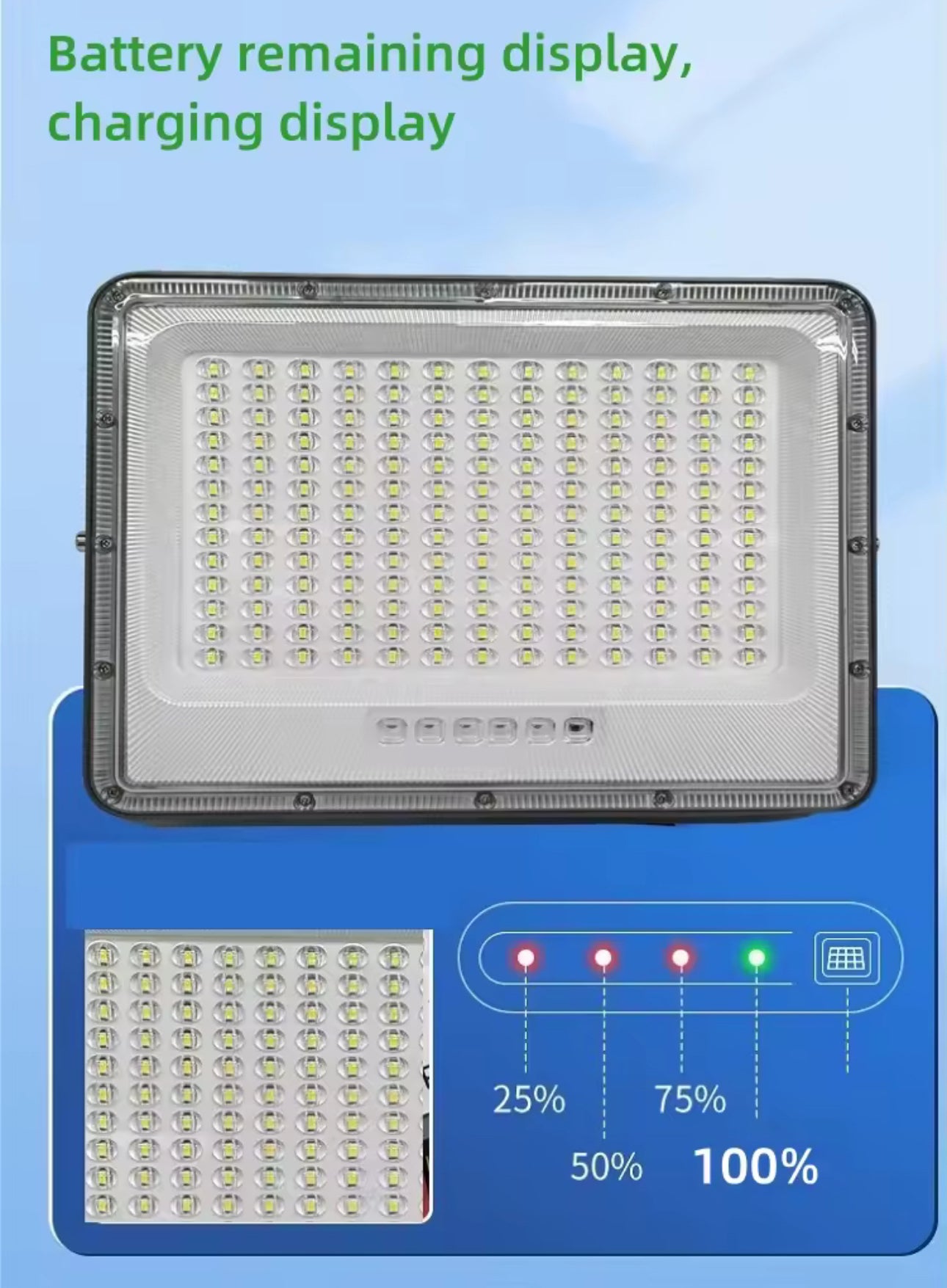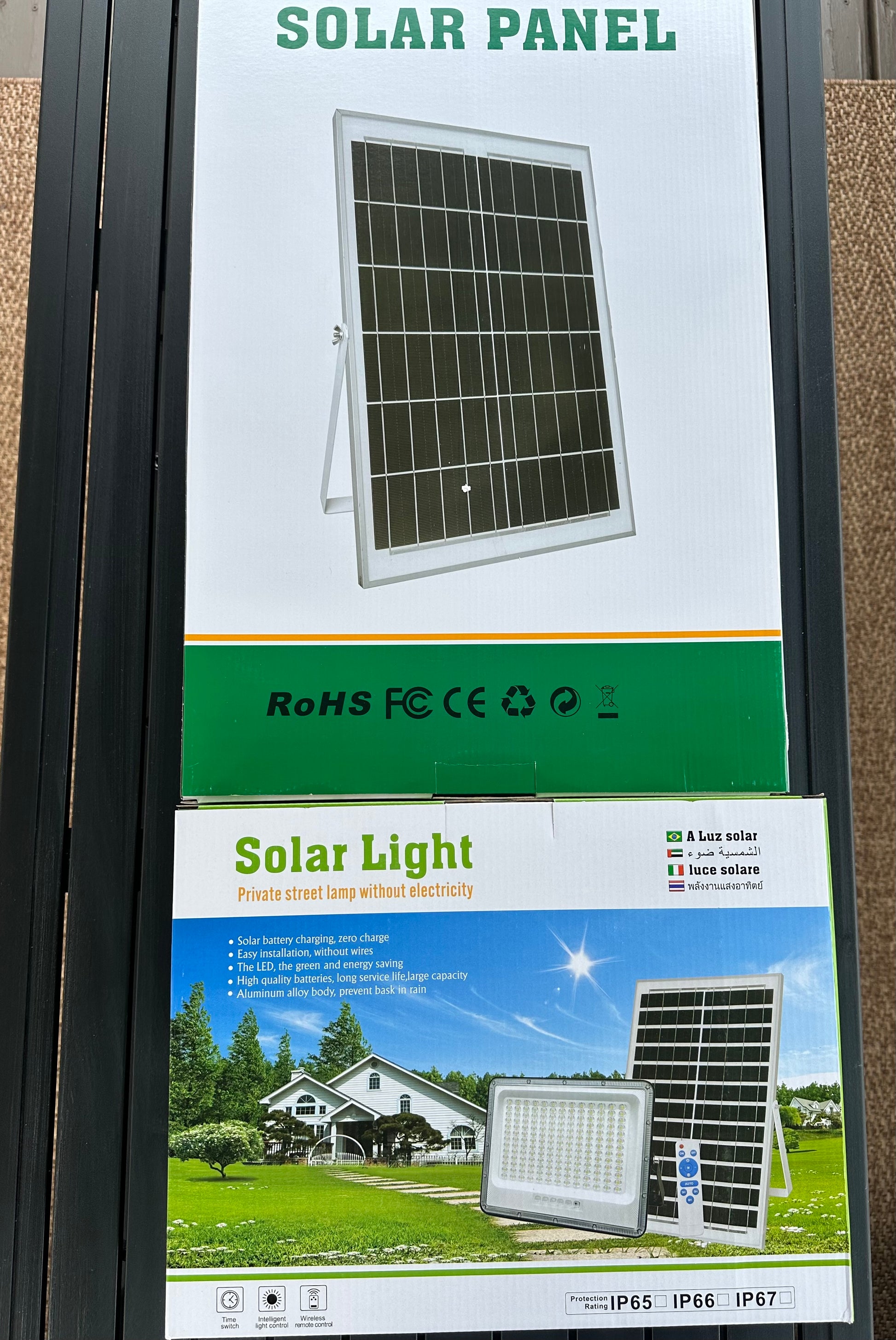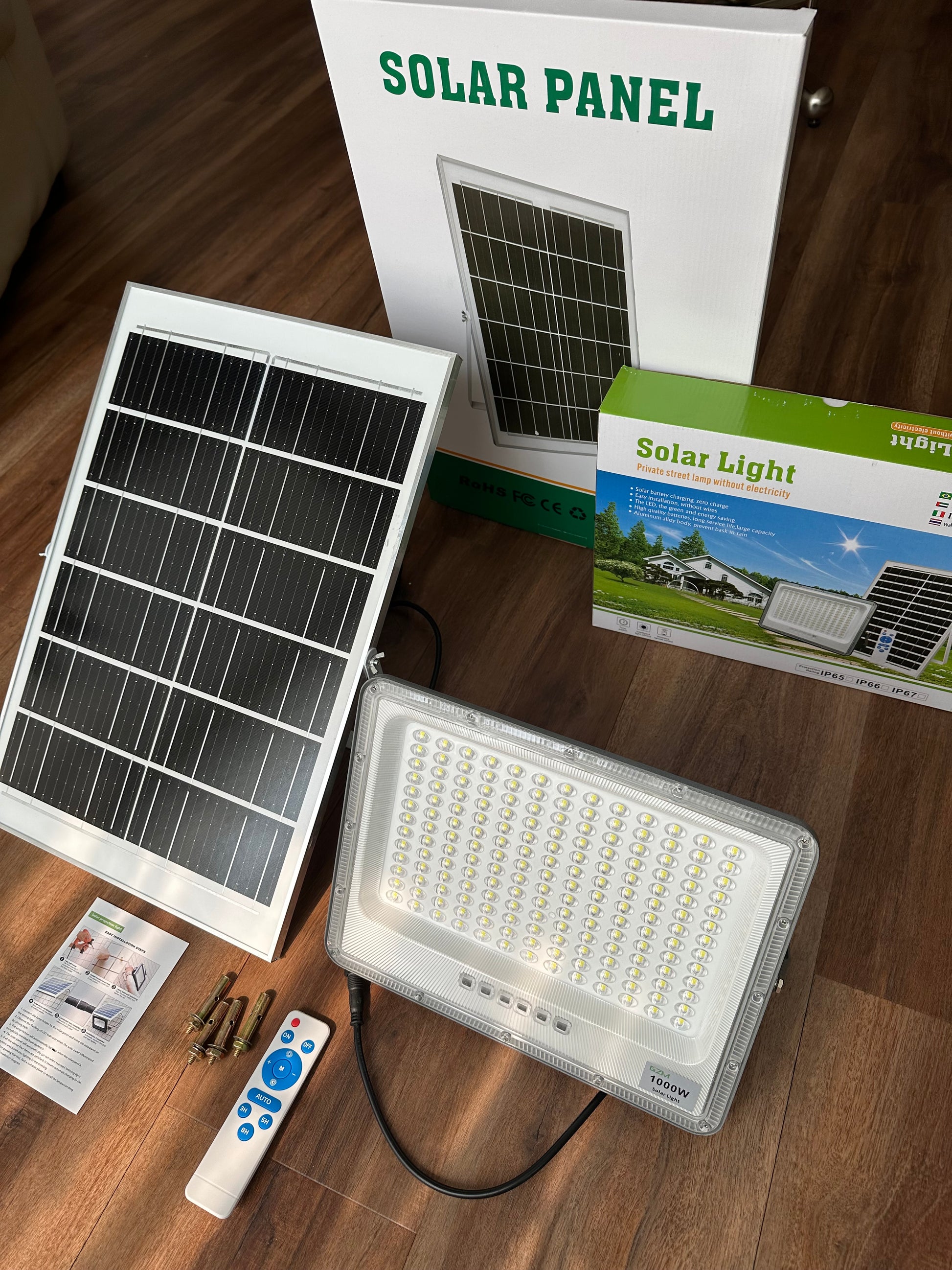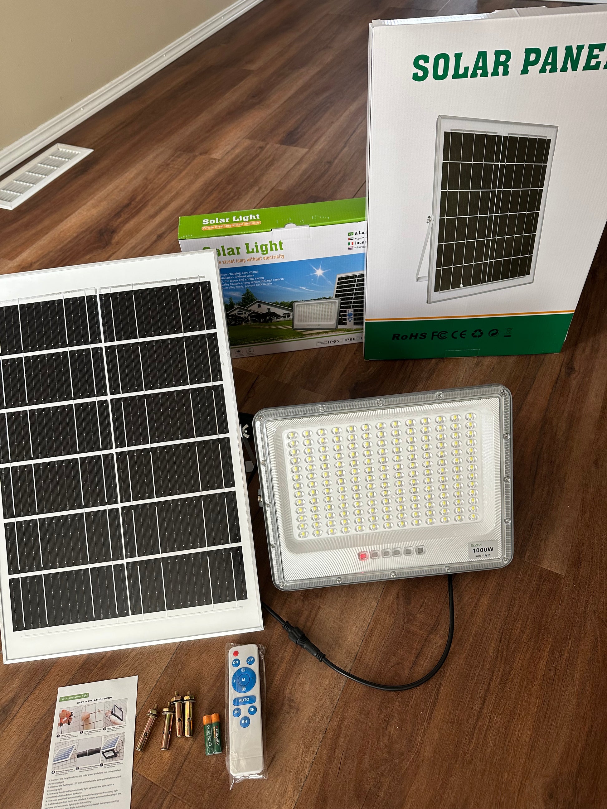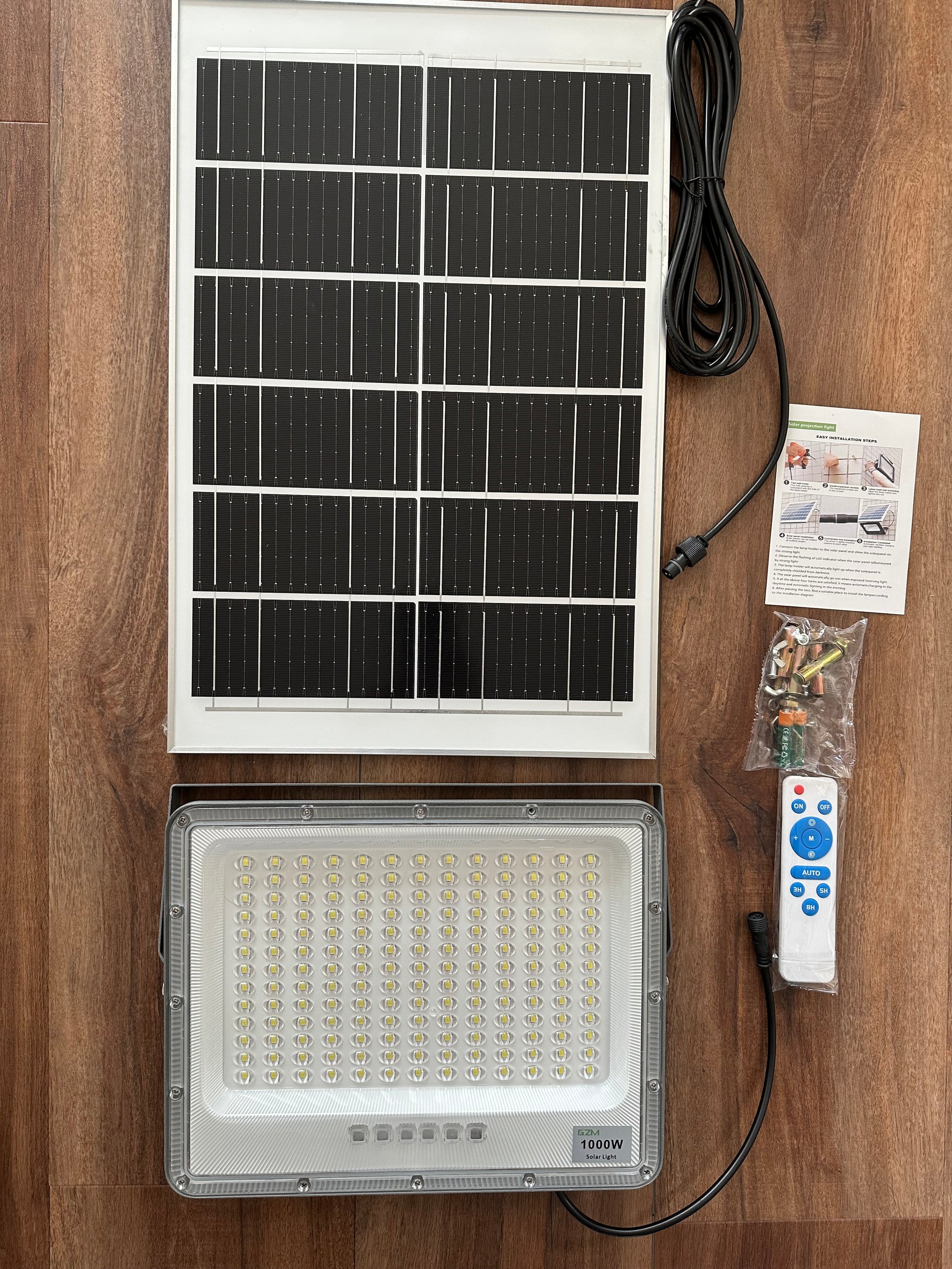 Solar Flood Light, 1000W, LED chip: SM5050/169, white light, 15000LM, motion sensor, IP67 waterproof, weatherproof, battery level display, remote control, polycrystalline silicon solar panel, illuminates 1,800-2,400 sq. ft., die cast aluminum lamp body, 5 meter cord. Perfect for security lighting for your driveway, backyard, pathways, courtyard, parking lot, and at the cottage.