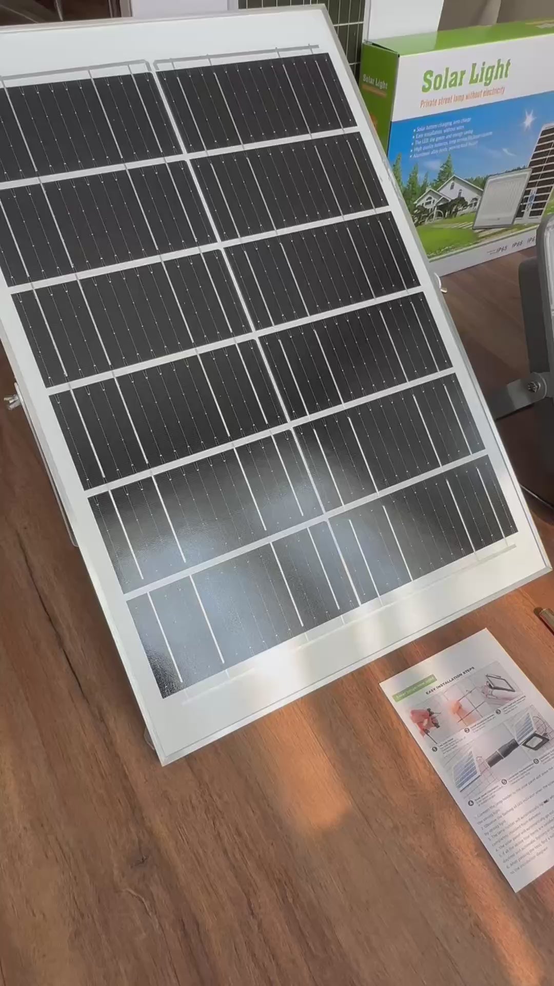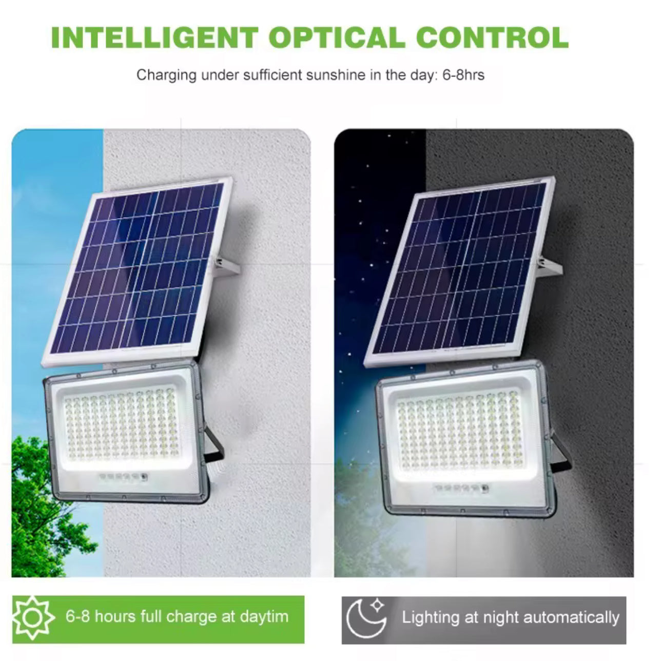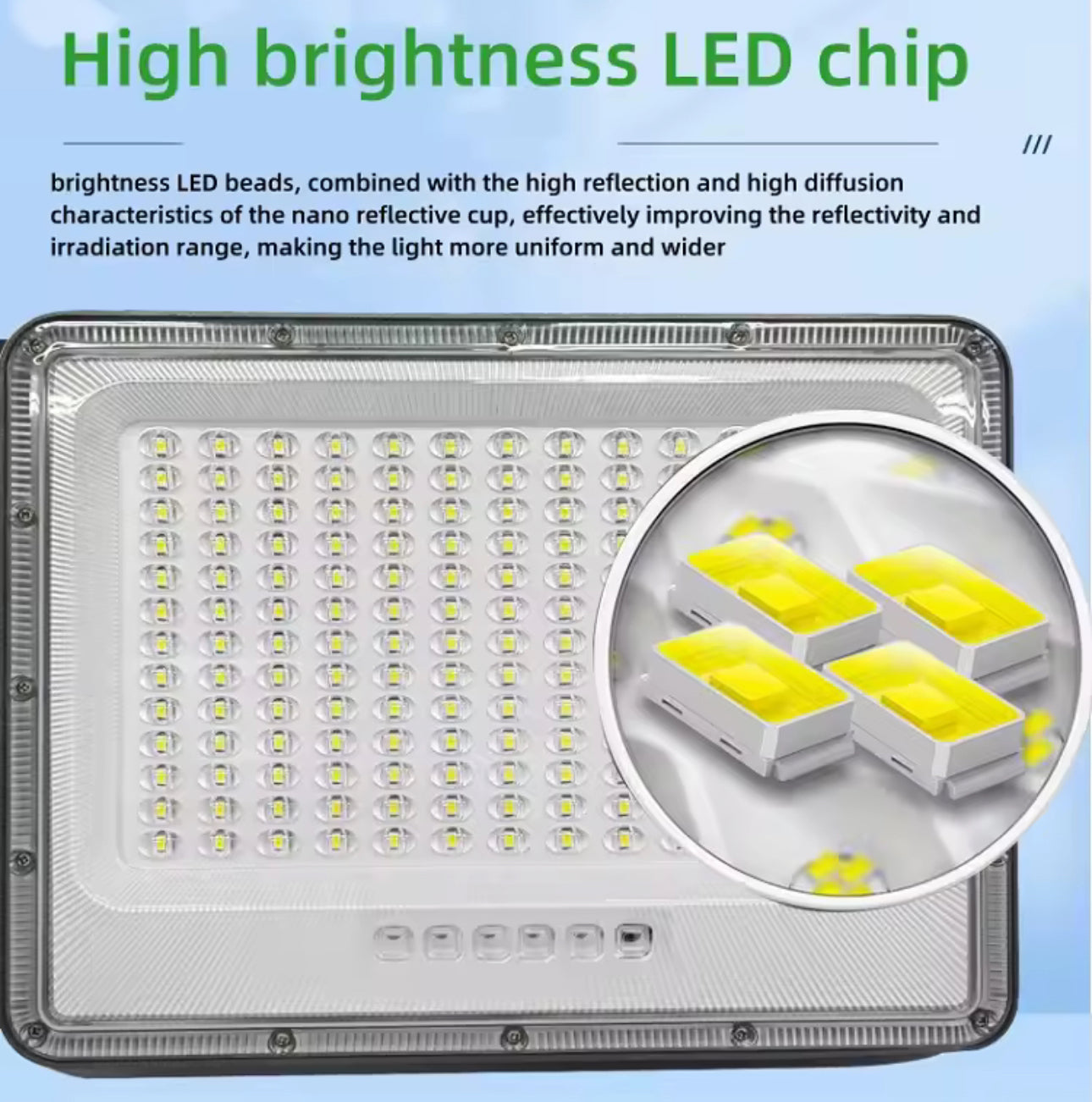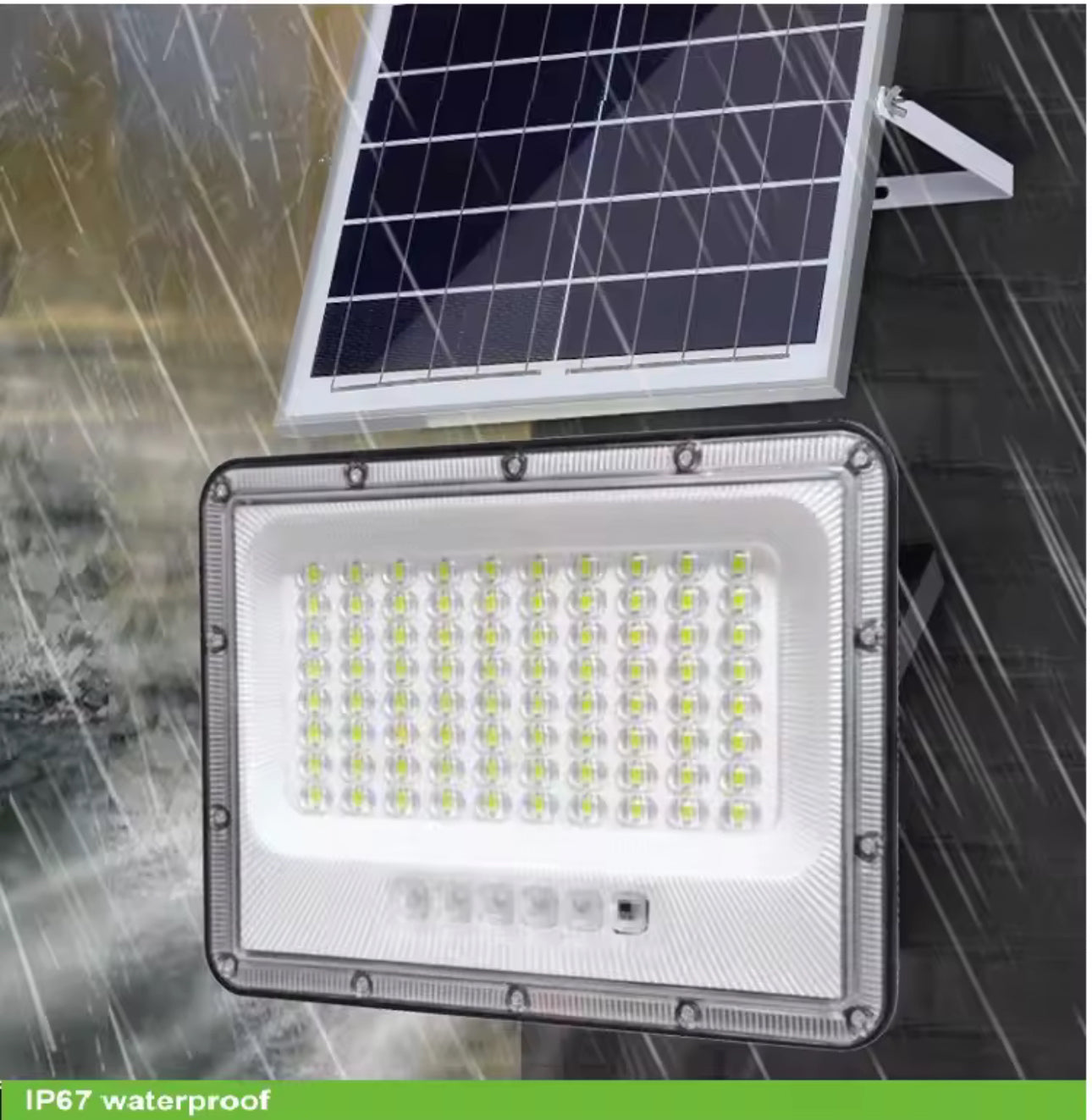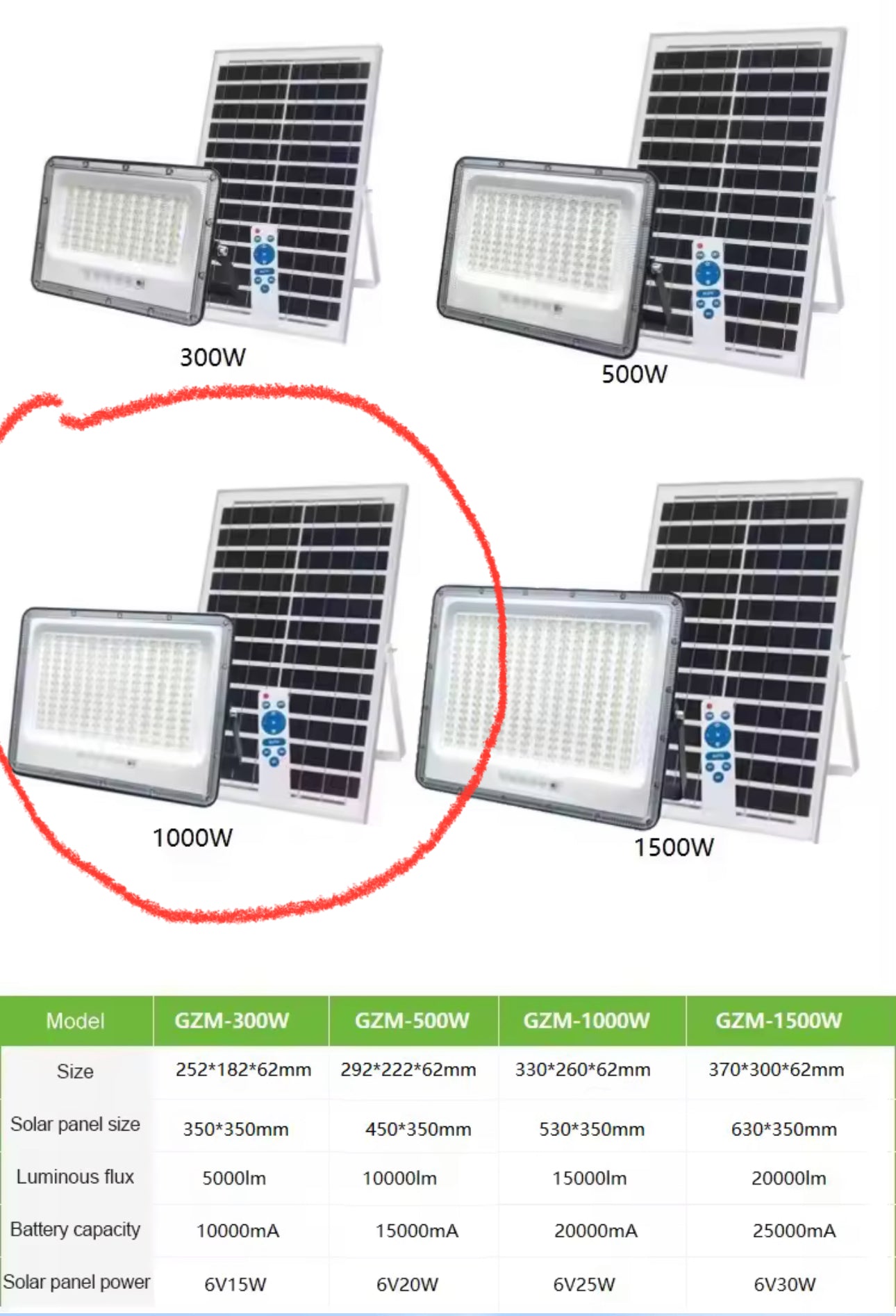 Solar Flood Light, 1000W, LED chip: SM5050/169, white light, 15000LM, motion sensor, IP67 waterproof, weatherproof, battery level display, remote control, polycrystalline silicon solar panel, illuminates 1,800-2,400 sq. ft., die cast aluminum lamp body, 5 meter cord. Perfect for security lighting for your driveway, backyard, pathways, courtyard, parking lot, and at the cottage.