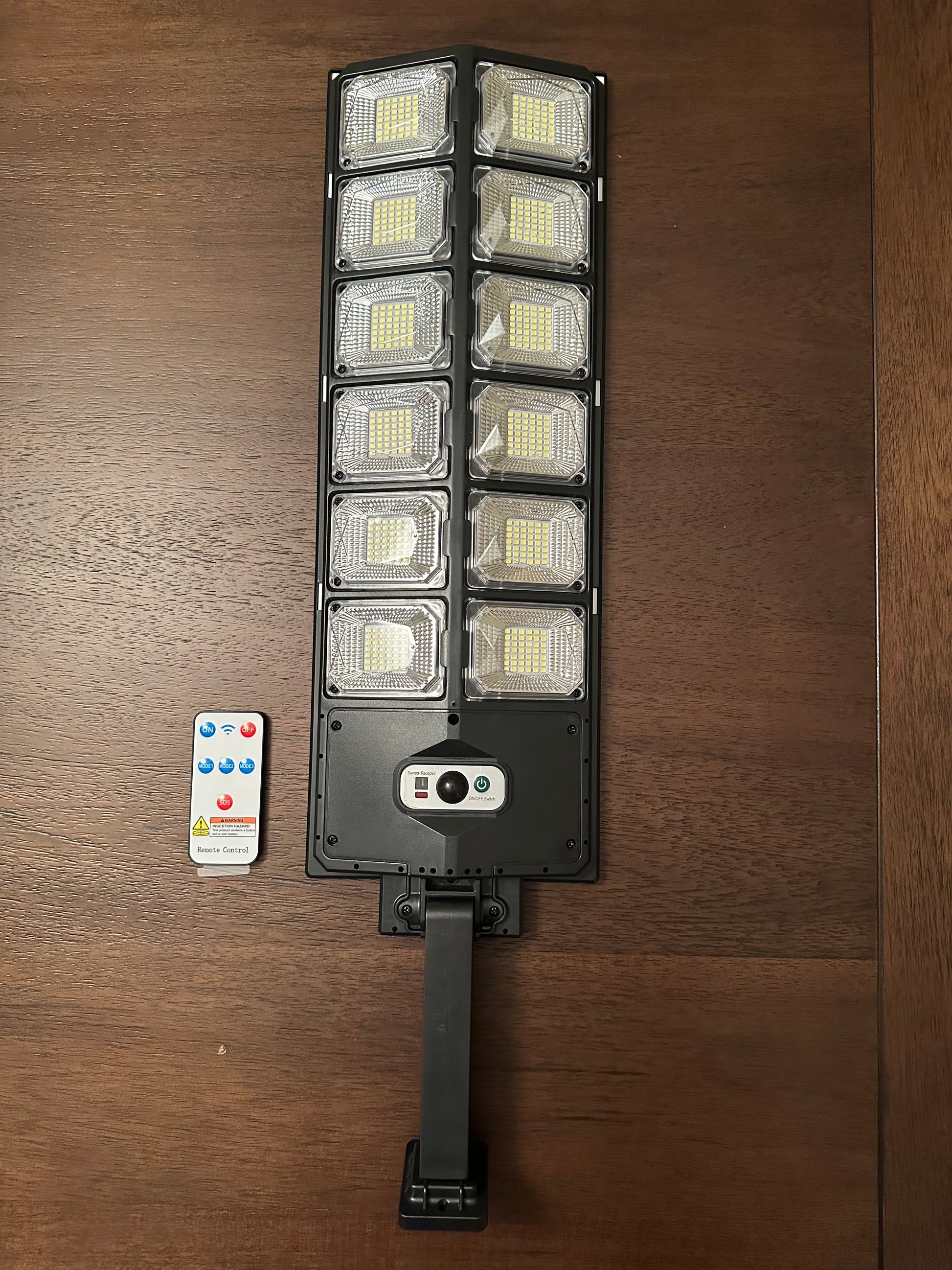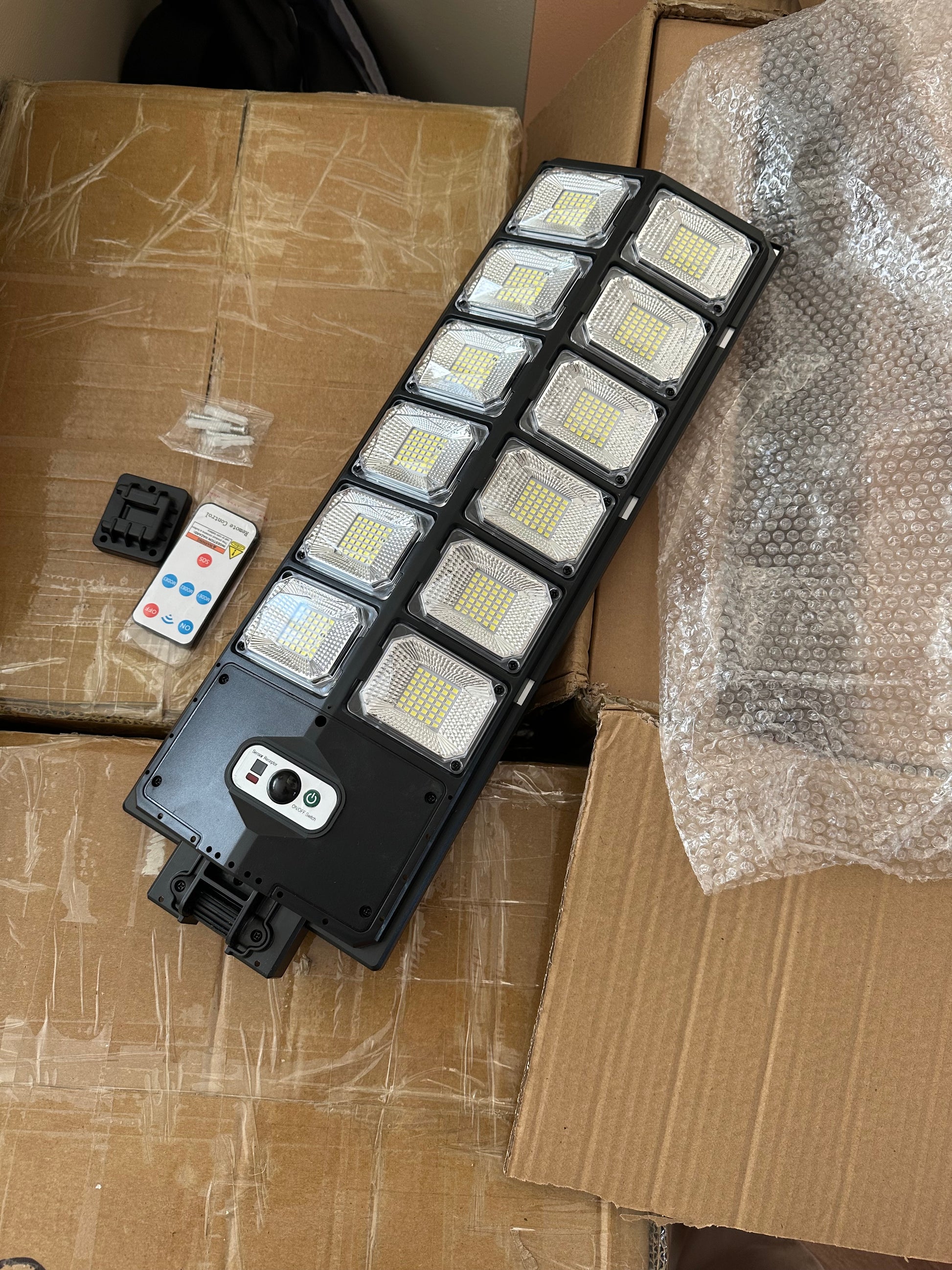 Solar Street Light, brand new, 1000W, with motion sensor, 3 lighting modes, charges battery during day, auto ON at dusk, 120 deg sensor range, large capacity 18650 battery, lithium iron phosphate battery, fast charging and long service life, 504 LEDs, polycrystalline silicon solar panel. Great for safety and security lighting for your backyard, driveway, pathways, patio, deck. Zero electricity bills. Great lighting for the cottage.